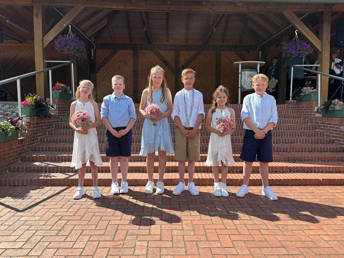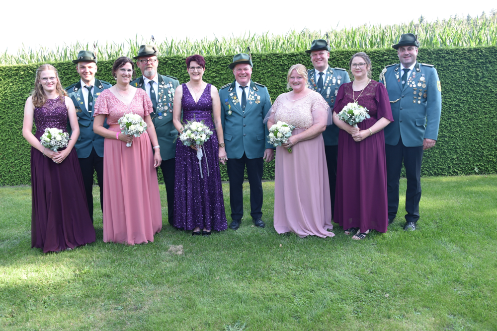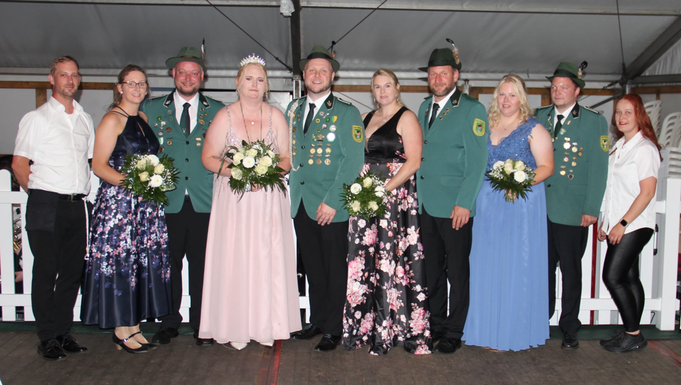Oliver Burhorst mit Hanna Windfuhr, Königspaar Julian Plötz und Annika Macke, Lukas Macke mit Leonie Haglage